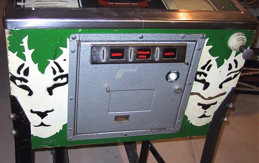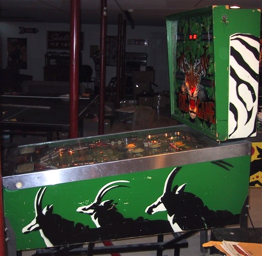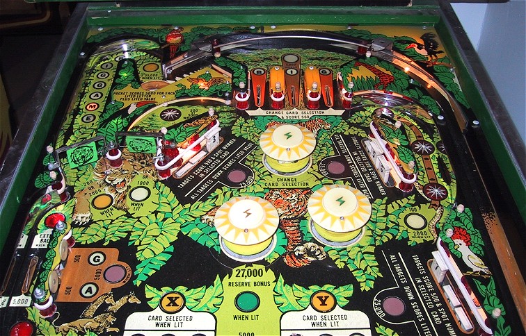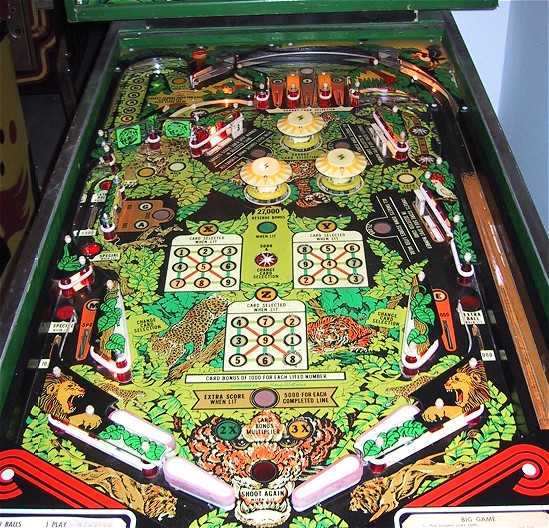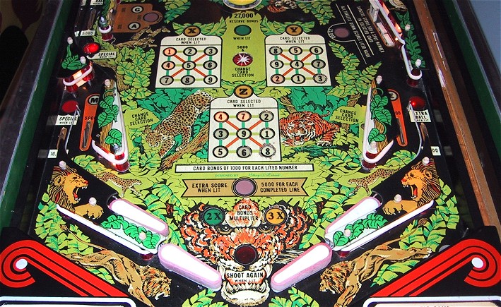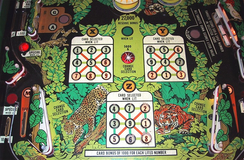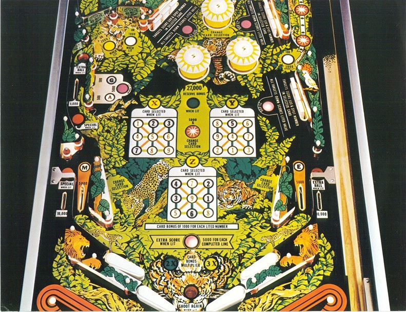Game play is extremely fast for a wide body pinball, the ball really moves. I didn't spent much time playing the game, but the basic scoring is a combination of drop targets and "bingo cards". There are three bingo type cards in the middle of the playfield, and you hit the corresponding numbered drop target to light up lines on the card. Doesn't quit fit into the jungle theme. The game was designed by Harry Williams and plays more like a fast EM machine than a SS. IMO, the game could have proved more successful as a standard body game, it would have been wicked fast and the only thing they would have had to remove was the "horse shoe" eject hole loop at the upper left of the playfield. That may have been the original idea for the game, but with the wide body trend in full swing, the game was "expanded".