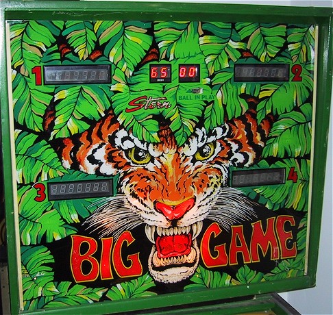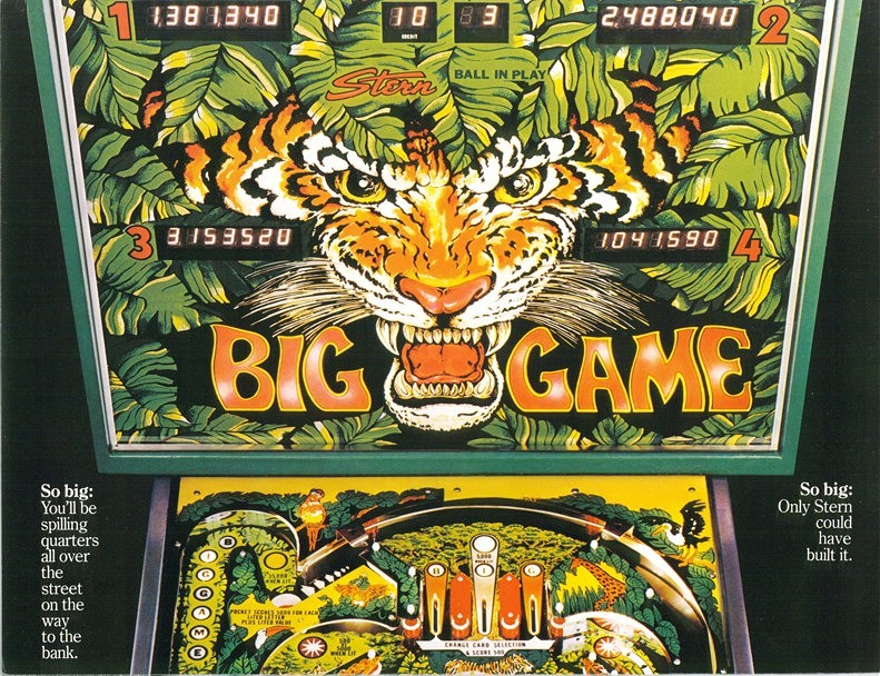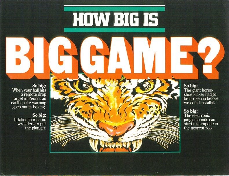 Stern's Big Game was produced in March of 1980 (same as Firepower!) and a total of 2,713 games were manufactured. Big Game is a "wide body" pin, following on a trend in the late 70s to produce wide body games (Bally Space Invaders, the Atari games, Williams Scorpion). This trend ended in 1981 only to resurface again in the early 90s with classics such as Twilight Zone.