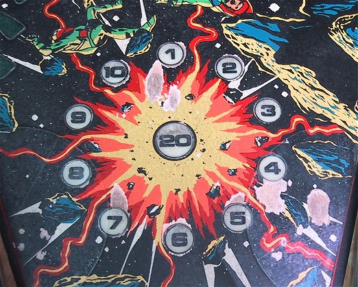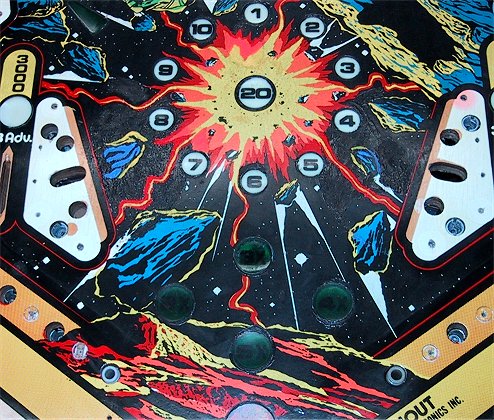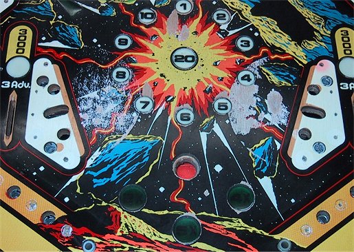 I did make an attempt to repaint the wear and area damaged by the Mylar removal attempt (see above photo), but the results were disappointing (no doubt my absolute lack of any artistic talent was a contributing factor <g>!) and I decided to scrap the restoration attempt on this playfield. Update March 2004 - This project has been on the back burner for almost two years now. I have in the past two years been able to obtain a replacement playfield that is much better shape. Maybe this will be year? Stay tuned! |