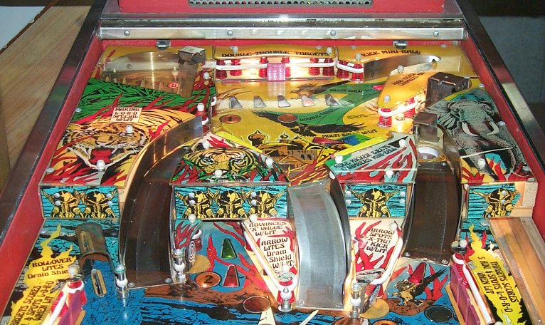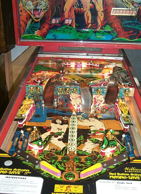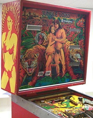 I'm a big fan of Black Knight, one of top 10 Pinball machines of all time in my opinion. Williams produced 4 "multi-level" games in 1980 and 1981; Black Knight, Jungle Lord, Pharaoh and Solar Fire. Since Black Knight is such a great game to play, I thought that I would attempt to collect all 4 of the System 7 multi-level games. This game showed up on the Mr. Pinball "for sale" list and was being listed from someone with 30 minutes drive! The asking price was under the Mr. Pinball valuation of $600, and it was the red cabinet version! Yikes, did I get a find or what (at least that's what I thought at the time). The game was being offered by a local collector who had about 20 other machines. He stated the condition as good, but not great. Worth the trip at least. The game was in the condition he had stated, probably a 7 if you're rating games. Nice condition, but a bunch of scrapes on the cabinet and head. The playfield was in good shape, just a ton of ball swirl marks, but no bare spots. He told me that he had taken it to the York show last year and was unable to sell it there. This surprised me, as I would have thought a red cabinet Jungle Lord would have been snapped up... Anyway, we sealed the deal and Jungle Lord came home with me. What can I say... The game was a dog. The sound effects were terrible. The play was pathetic. There are no pop bumpers on the game and I'm a big fan of pop bumpers There's not much to accelerate the ball on the playfield, giving the impression of a very "slow" game. The play is focused around the drop targets on the upper level. One drop target is up at first, then when you hit that one, two others pop and you need to get those two down. Get two down and three pop up. I tried to like the game (as the seller said, "its a shooters game"), I really did. I also noticed that nobody else played the game more than once. After about 6 months I listed the game on Mr. Pinball and got zero takers after a month of being up. I then put it up on Ebay, with a reserve set to what I paid for the game. Didn't even hit the reserve. So much for the red cabinet being worth anything.... I then received an email a few days later from somebody in Texas who said he had missed the end of the auction and the person he had told to bid on it for him forgot to. "Was it still available?"... you betcha... I did say no shipping in the listing however. "Can you put it on a pallet and I'll arrange shipping?". Anything to get rid of it. "Sure!" Now I see why people don't ship. What a pain that was. Even though he arranged shipping, the guy showed up with a truck without a lift gate and said "can you help me get it up on the truck?". No way buddy, the Bill of Lading says a lift truck will show up, come back with a lift. He muttered a few things truck drivers are known to mutter and left. The next day another truck, this time with a lift, and another driver showed up. Evidently my driver from the previous day had gone back to the terminal and said what I wimp I was for not helping lift the palleted machine up into his truck. According to the new driver, he (yesterday's driver) was too lazy to go back to the terminal and get the right truck and tried to blame me for missing the pickup. I never did hear from the guy who bought the machine, so I have no idea if it made it to Texas in one piece or not. He said that he wanted to collect all of the system 7 multi-level machines and was so excited to find this one (where have we heard this before!). Guess he discovered its a dog also... I'm watching Ebay to see if it shows up again! Note on the "red" cabinet version. Supposedly about 100 were made as the initial "sample" games. Williams somehow though that they weren't getting enough play because of the color of the cabinet. (Could the fact that its a lousy game have had anything to do with that?). Williams went back and changed the cabinet color to blue, plus made subtle changes to the playfield colors and to the backglass colors. The remaining production run of 6,000 games were produced in the "blue" version. Update 12/4/01 - There's been some activity on RGP (rec.games.pinball newsgroup) over the past few months regarding the version differences. Since I no longer own the game, I can't contribute to this topic as much as I would like. However, Jess Askey has updated his Jungle Lord page to document the differences between the two versions in depth. If you're interested in the subtleties between the versions beyond the cabinet color, you can find more info here. These are the photos I used in the Ebay Listing: This is a nice shot