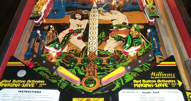 Jungle Lord was manufactured by Williams starting in January of 1981. 6,000 games were produced. Jungle Lord was the second of the four two-level System 7 games that Williams produced. Jungle Lord was produced in two versions, a "red cabinet" version and a "blue cabinet" version. Only about 100 or so red cabinet versions were produced. You would think that would make them somewhat valuable.... think again.... More Jungle Lord Resources from Mark's Pinball Page: