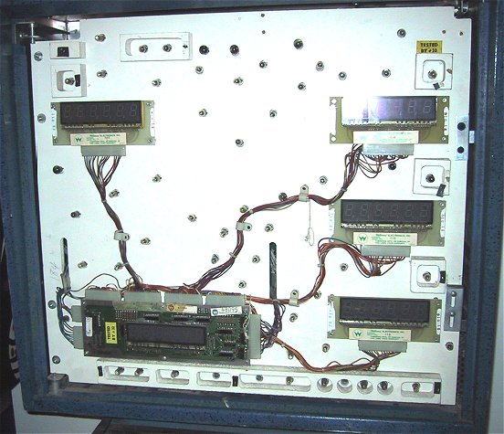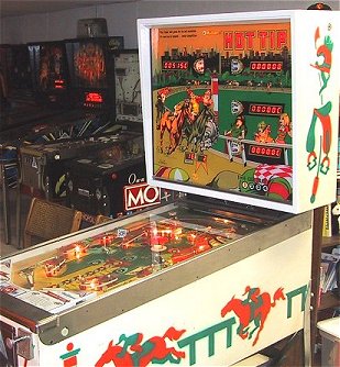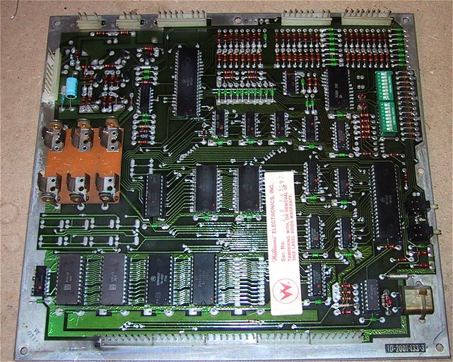 circuits: The two bridge rectifiers bolted to the backbox are for Solenoid and Lamp power and have nothing to do with the logic (CPU) power. Same goes for the large capacitor mounted in the back box, its used for the lamp power supply only. Another often confused area is the value of the +12 volt unregulated power circuit. Since it is not regulated, it will vary depending on the line voltage. It can range anywhere from 10 to 14 volts, and this is normal. This voltage is monitored by the MPU board to determine when you've turned off the power so it can shut down things like the displays so they're not damaged during power down. People will attempt to "repair" their power supplies because they're not getting 12 volts, only 11 volts. Later System 7 games used 50 volt flipper coils and had an additional "flipper" power supply board (and an additional transformer in the cabinet). Sound Board The first two Williams Solid State games, Hot Tip and Lucky Seven, continued to use "chimes" like the electro-mechanical games. Hot Tip also had a "dummy" score reel in the cabinet that would be incremented to make the familiar scoring sound. World Cup was the first Williams game to use electronic sound. Sound boards are actually self-contained computers, complete with their own power supply, microprocessor and PIA. The game "sees" the sound board as a set of solenoids, using the same controls on the driver board to trigger different sounds as it would to fire a solenoid. Games from World Cup to Pokerino used a sound board that would generate a sound when an activity occurred (scoring, etc.). However when the ball wasn't hitting anything, no sound was being produced. Starting with Flash, a revised sound board was used that would generate "constant" or "continuous" background sounds. These usually varied in pitch as scoring increased, giving the player an adrenaline boost when things really got going. Gorgar introduced speech to the pinball world. A redesigned sound board featured a connector for an add-on speech module. Speech was featured on Gorgar, Firepower, Blackout, Alien Poker, Black Knight, Jungle Lord and Pharaoh. The recession of the early 80s that almost drove Williams out of business caused major cost cutting moves in pinball production, and speech was eliminated from all System 7 games after Pharaoh. The sound board in these later games is missing the connector that was used to connect the ribbon cable from the speech board to the sound board, showing how far they went in reducing production costs. Displays Williams used a standard 6 digit gas filled display in all its games through Algar. These are still widely available today. Most displays today have a "nipple" where they were sealed. These will work fine as a replacement, and most display boards already have a hole drilled in them. The last two System 6 games (Algar and Alien Poker) use 7 digit displays and all System 7 games used a 7 digit display. Display Driver The display driver is mounted just behind the backglass on the front of the display panel. The display driver also contains the credit/match display. The job of the display driver is to take the binary score data coming from the MPU board and translate into the signals understood by the displays. There were two versions of the display driver manufactured, and both are compatible in all games. One uses "discreet" components (meaning a large number of individual transistors) and the other uses integrated circuits. The reason for this is that the UDN6184 "segment driver" chip that Williams used became very short in supply. Williams designed an alternate board that replaced the functionality of the UDN6184 with individual transistors. The UDN6184 chip continues to be in short supply today, and averages between $15 and $20 a piece. Display board from a System 6 game showing the 4 score displays and the combination display driver/credit match display unit: